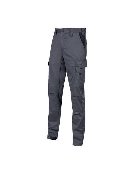 In cotone elasticizzato. Dotato di due ampie tasche multifunzionali laterali, due tasche anteriori e una tasca posteriore. Chiusura centrale con zip e bottone gommato antigraffio. Elastico in vita e carré posteriore accentuato per una maggior protezione della parte lombare. Nastro rosso/reflex su passante tubolare posteriore. Ginocchia pre-formate per un maggior comfort. Fettuccia porta martello. Battitacco con tessuto di rinforzo anti usura. Vestibilità slim-fit.