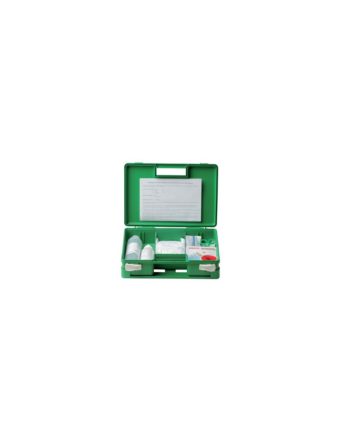 In polipropilene, dotata di supporto integrato per attacco a parete e di chiusura con clip a scatto. Contenuto conforme al D.Lgs. n. 81/2008 - All. 2 D.M. 388/2003 Gruppo C per aziende o unit... produttive con meno di tre lavoratori e per lavoratori che prestano la propria attivit... fuori dalla sede aziendale.