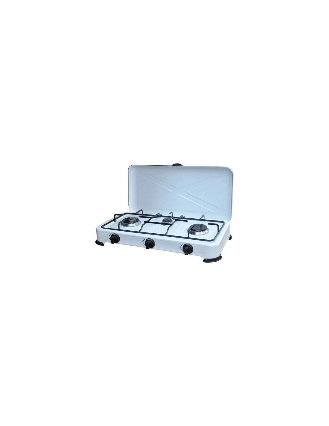 Piano cottura con tre bruciatori in acciaio inox a potenza elevata. Struttura in acciaio smaltato. Adatto per uso casalingo, campeggi, pic nic e tempo libero. Con piedini antisdrucciolo. Potenza 2,9 kw.
