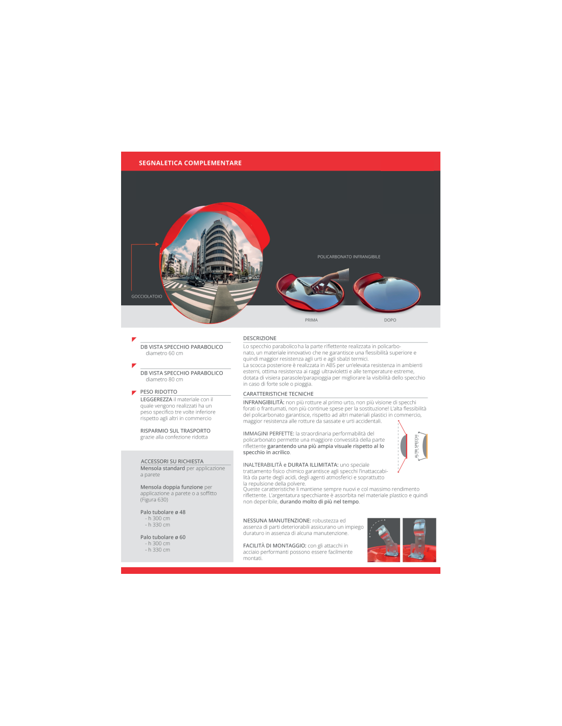 Tipo 'eco'. Lente riflettente realizzata in policarbonato, altamente flessibile e fortemente resistente agli urti e agli sbalzi termici. Infrangibile, riflette immagini perfette grazie alla sua maggiore convessita'. Lo speciale trattamento garantisce l'inattaccabilita' da parte di acidi e ottima repulsione della polvere. Molto leggero, non necessita di nessuna manutenzione. Scocca posteriore in ABS. Dotato di cupolino superiore a protezione del sole e della pioggia. Completo di supporto per fissaggio a palo da Ø48/60 mm. Made in Italy.