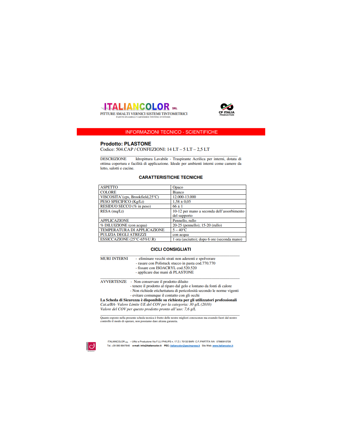 traspirante, acrilica per interni dotata di ottima copertura e facilità di applicazione. Ideale per soffitti e pareti di camere da letto, salotti e cucine di grandi superfici. Aspetto opaco. Resa 10-12 m2/l a seconda dell'assorbimento del supporto. Diluizione con acqua: 20-25% (pennello); 15-20% (rullo).