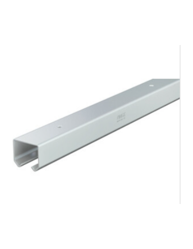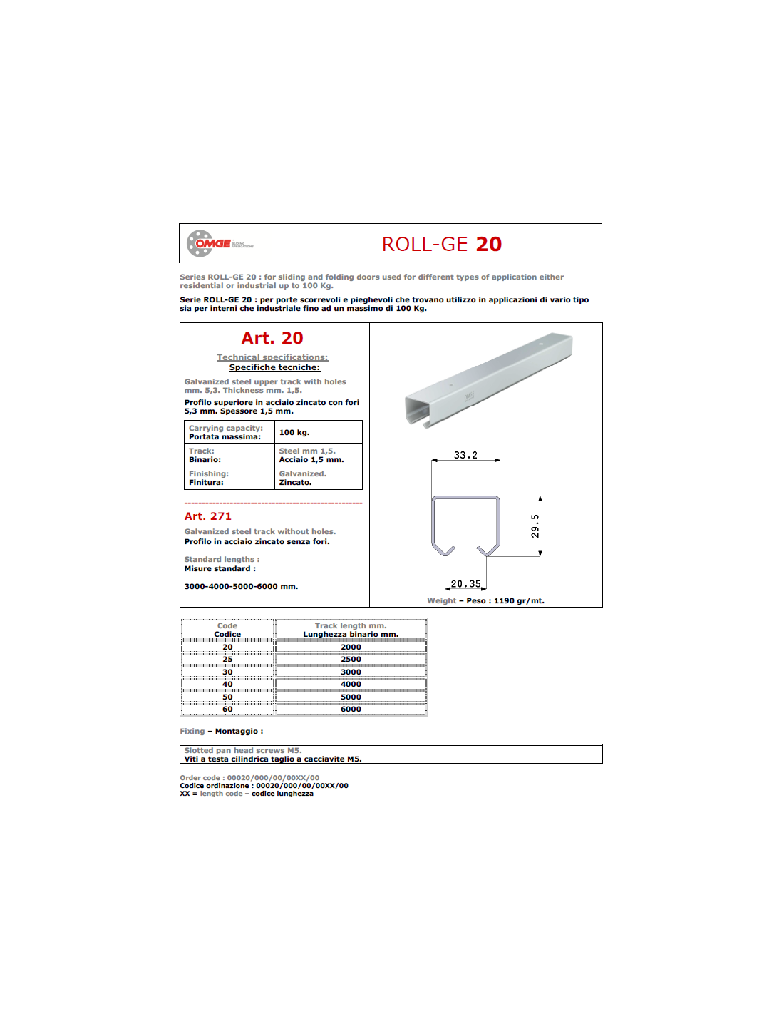 Art. 20 e pighevoli, binario 33,2x29,5 mm in acciaio zincato. Spessore 1,5 mm. Portata max 100 kg. Lunghezza 3 m.
