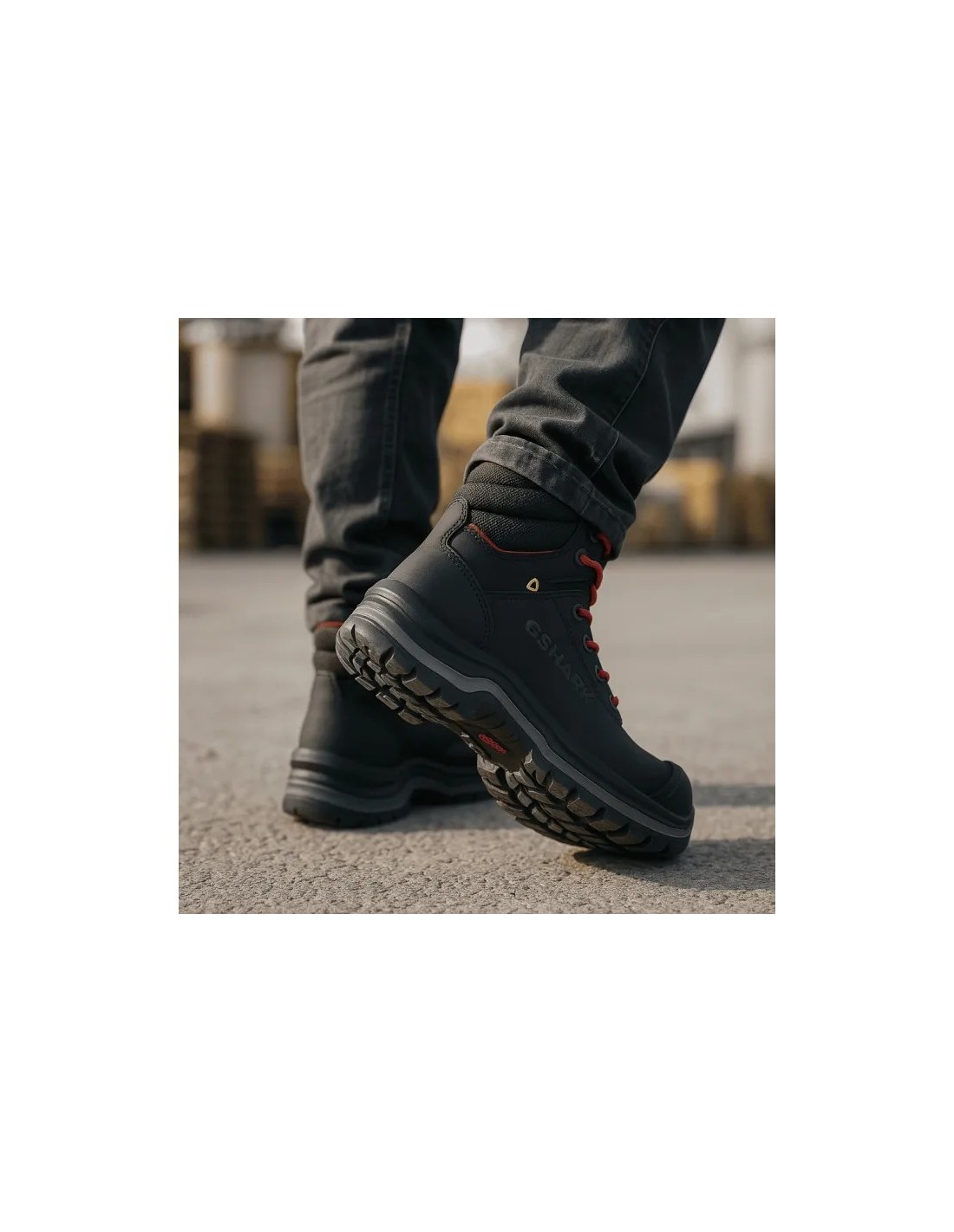 Scarpe Antinfortunistiche Alte Boss sono dotate di tomaia in pelle bovina nera, fodera in tessuto non tessuto poliestere di colore bianco con mesh in Poliestere di colore Rosso, puntale in Composito, lamina antiperforazione in Composito, soletta in poliestere nero + PU, suola in PU/Gomma. Normative: S3S, FO, SR, ESD.