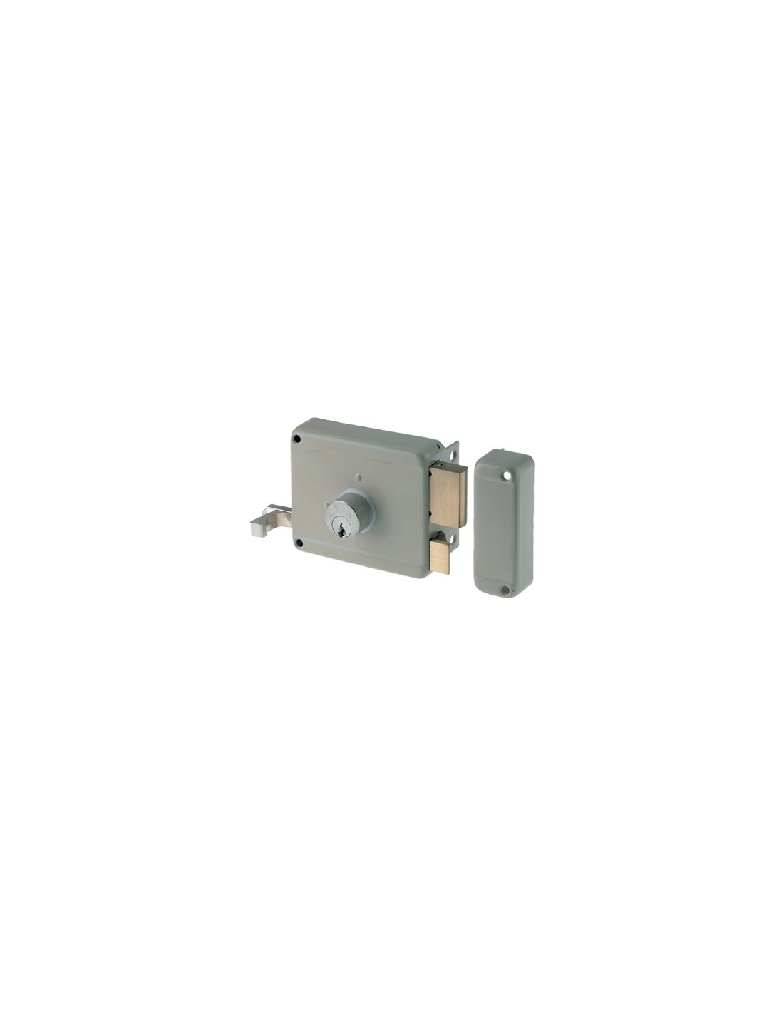 Con cilindro esterno fisso. Scrocco azionato dall'esterno mediante chiave e dall'interno mediante tirante. Chiusura a catenaccio a 2 mandate azionato mediante chiave dall'interno e dall'esterno. In acciaio verniciato. Scatola Mm. 100x85. Bocchetta Mm. 32x85. In dotazione: 1 bocchetta, coppia cilindri interno/esterno e 3 chiavi piatte.