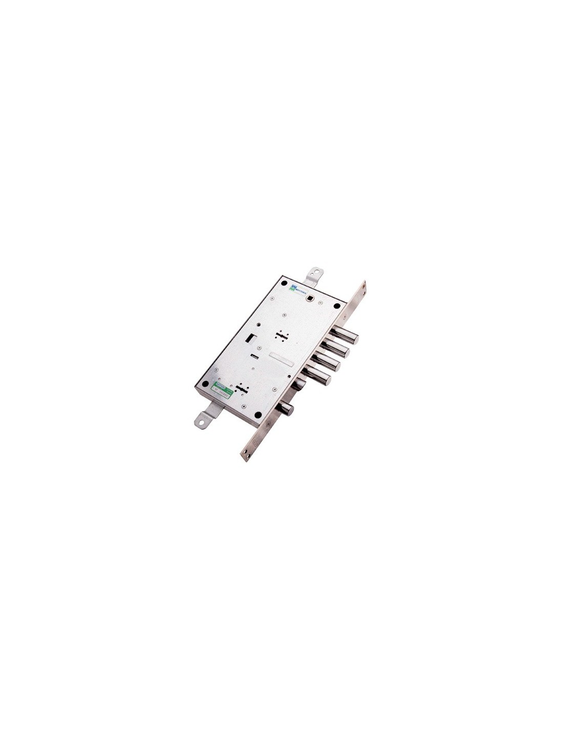 Doppio sistema di chiusura a doppia mappa. Scrocco azionabile da chiave o maniglia. La parte superiore aziona la chiusura triplice con catenaccio a 4 pistoni e 4 mandate, corsa Mm. 40, e predisposizione per fissaggio aste, corsa Mm. 20. La parte inferiore aziona 1 catenaccio a 1 pistone e 2 mandate, corsa Mm. 18, e blocca la serratura superiore. Quadro maniglia Mm. 8, interasse Mm. 85. Frontale con bordo quadro da Mm. 35x356. Scatola Mm. 136x254. In acciaio zincato. In dotazione: 3 chiavi superiori. 3 chiavi inferiori, mostrine interne ed esterne.
