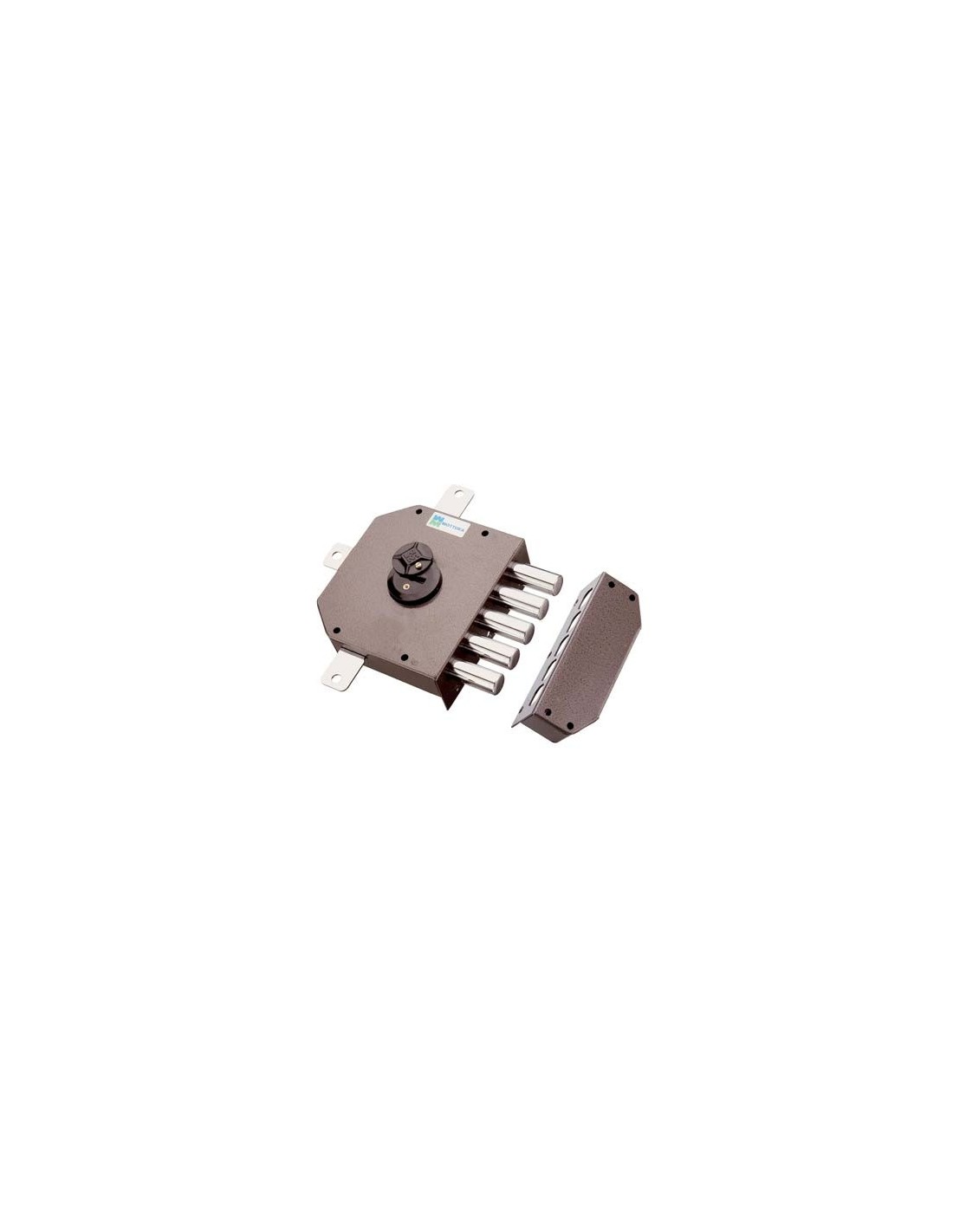A doppia mappa. Chiusura quintupla con catenaccio a 5 pistoni e 4 mandate, corsa Mm. 40, predisposizione per fissaggio aste, corsa Mm. 17, e deviator...
