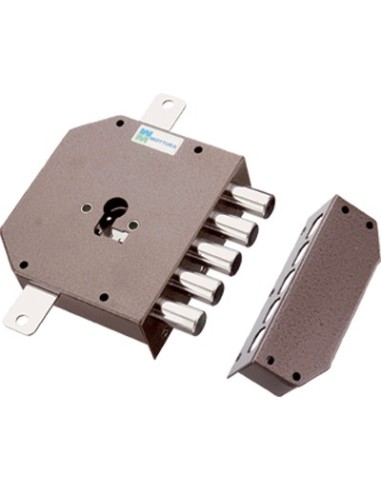 Per cilindro sagomato. Chiusura triplice con catenaccio a 5 pistoni e 2 mandate, corsa Mm. 29, e predisposizione per fissaggio aste, corsa Mm. 17. Sc...