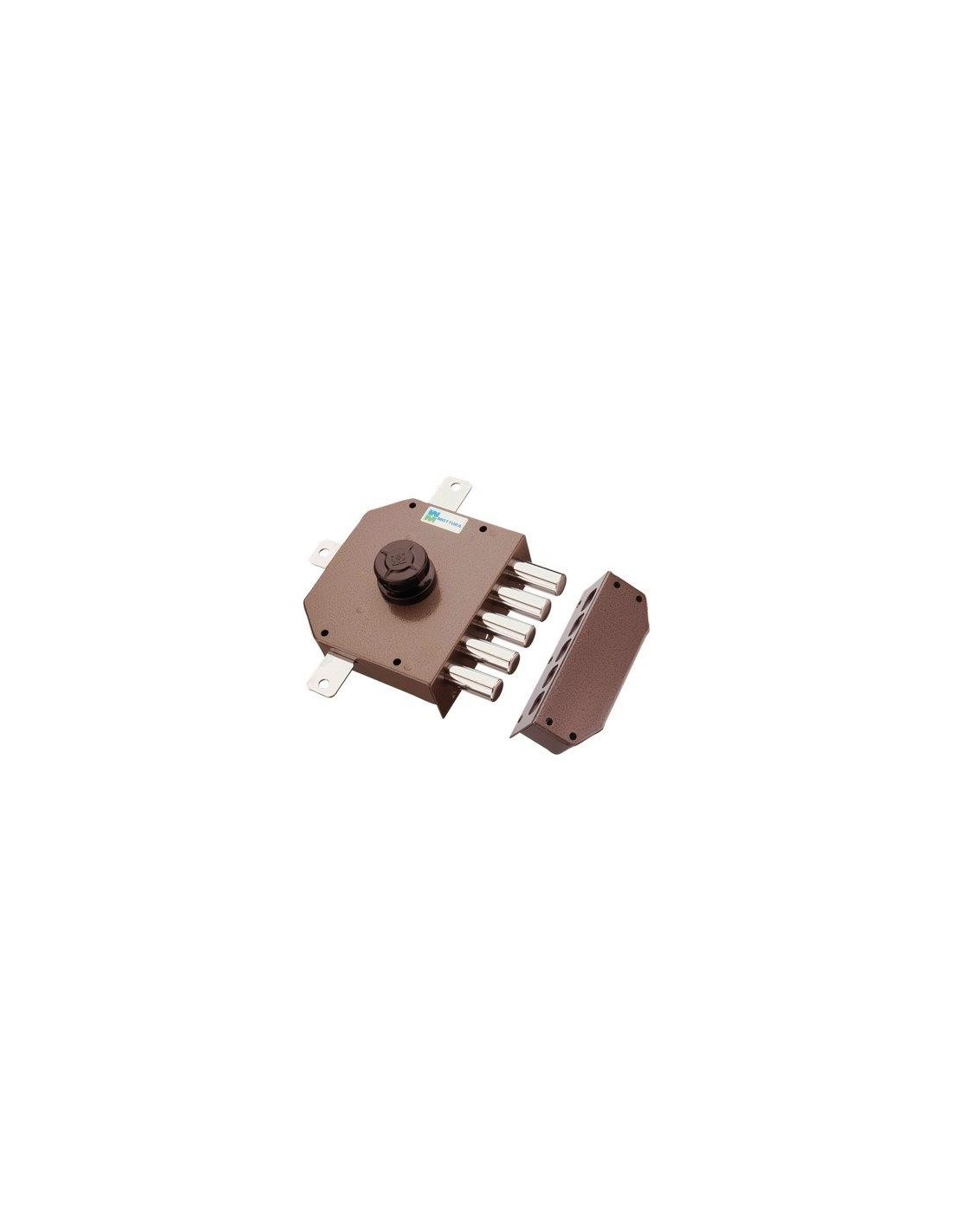 Con cilindro a pompa esterno Mm. 60x34 e pomolo interno. Chiusura quintupla con catenaccio a 5 pistoni e 4 mandate, corsa Mm. 40, predisposizione per fissaggio aste, corsa Mm. 17, e deviatore. Scatola Mm. 132x146. In acciaio verniciato. In dotazione: 3 chiavi, 1 mostrina, 1 ferrogliera, 2 passanti aste, 1 cavallotto, 1 bocchetta a pavimento e viti per il montaggio.
