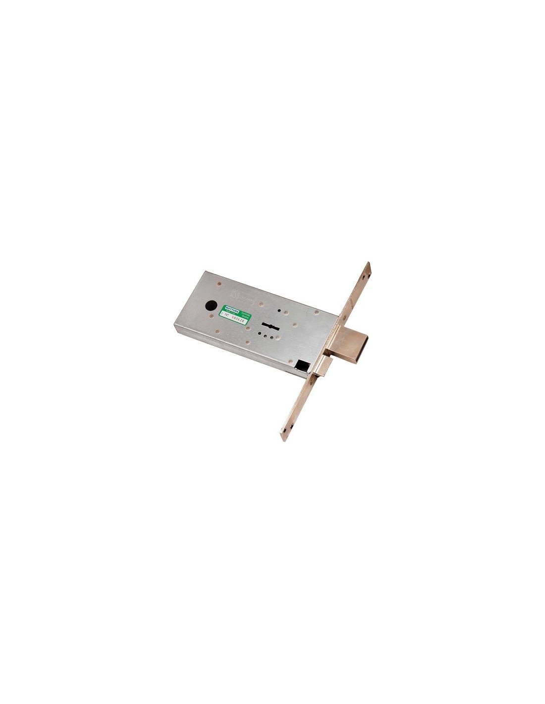 A doppia mappa. Scrocco reversibile. Chiusura con catenaccio a 4 mandate, corsa Mm. 36. Quadro maniglia Mm. 8. Borchia interna in acciaio. Frontale in acciaio zincato con bordo quadro da Mm. 25x240. Altezza scatola Mm. 82. In dotazione: 3 chiavi, 1 coppia di mostrine, 1 ferrogliera, e viti per il montaggio.