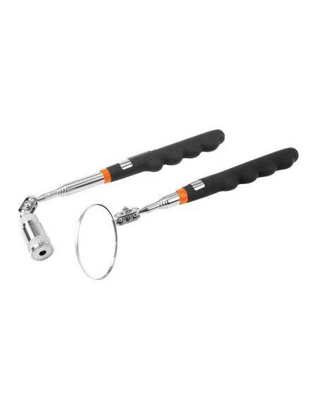 Impugnatura morbida ed ergonomica. Una asta telescopica cromata con specchio d'ispezione estensibile fino a Cm. 71. Una calamita telescopica con luce...